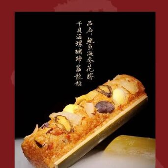 外包装显示,该粽子属于“竹粽”,品名为“鲍鱼海参花胶干贝海螺猪蹄筋龙粽”,单个粽子重量为500克。