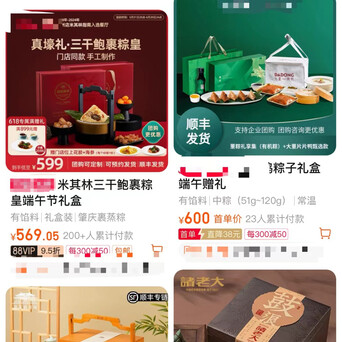 如京东平台上,“清凉一夏节日礼品店”标价999元的董到家“大董鲍鱼粽礼盒”,该礼盒外包装为PU盒面压金、烫纹,“东方龙图腾的古典与现代极简设计结合”。礼盒分为上下两层,上层装着端午祝福卡和3个口味共6个粽子,包括黑松露焗软心鲍鱼粽、XO酱鸡枞菌鲍鱼粽、伊比利亚火腿鲍鱼粽,单个粽子重160克,每个粽子均价166.5元;下层礼盒中装着赠送的盘子、刀叉。